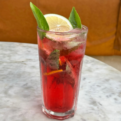 Mix of Cranberry Juice, Peach, Basil Leaves with Sweet & Sour Soda