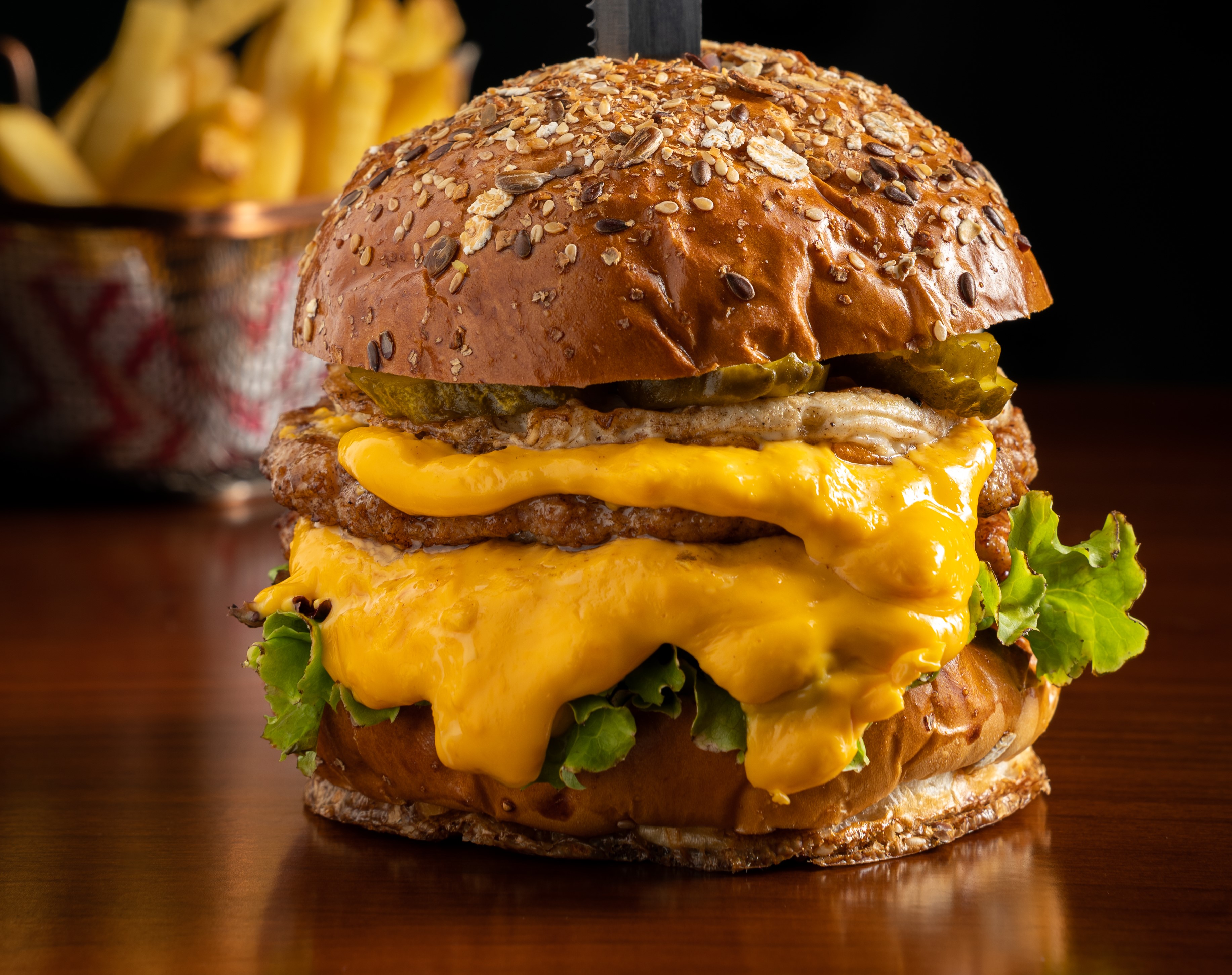 Char grilled smashed hot & Spiced chicken patty, Bang Bang Sauce, gherkin, lettuce and American cheddar