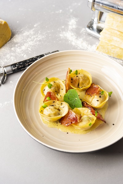 Slow roasted pork & english cheddar tortellini, honey fennel butter sauce and crispy bacon